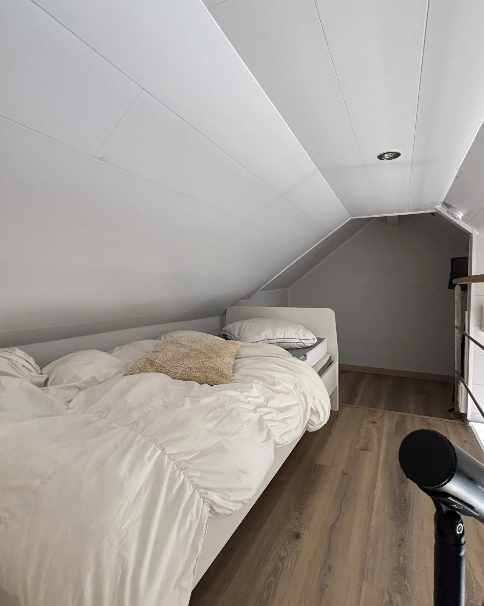 Le studio se compose d’un espace de vie moderne avec mezzanine, d’une cuisine équipée, d’un bureau sous velux et d’un lit en hauteur pour un confort optimal.